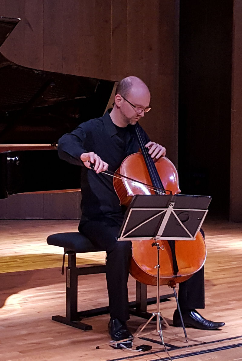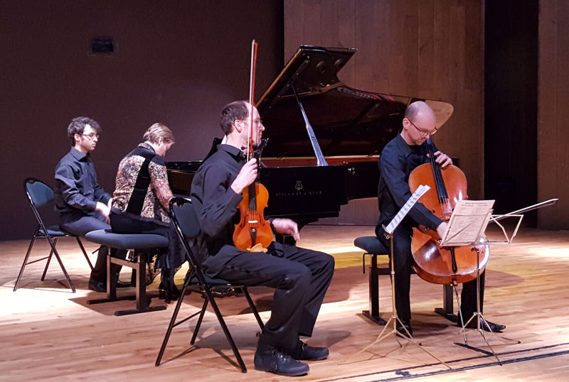 Russie donc, avec les 3 pièces pour clarinette de Stravinsky par Ayumi Mori, accompagnée par des danseuses du Conservatoire, puis le 3e mouvement de la 4e sonate de Prokoviev superbement joué par Matthieu Acar, ainsi que 3 préludes pour piano écrits à la fin de sa vie par Edison Denisov, tour à tour impressionnistes, romantiques ou espiègles – Denisov : c’est toujours intéressant et élégant. On entendit ensuite du même Denisov (dont la fille était assistait au concert) sa sonate pour Saxophone et piano, très belle oeuvre assez déclamatoire. On peut en retrouver une lecture plus ancienne par le même saxophoniste Carl-Emmanuel Fisbach dont on reparle plus loin. Il me semble qu’on baisse d’un niveau dans l’élégance avec Improvisation pour violoncelle d’Alfred Schnittke, mais c’est affaire de goût – elle était très bien défendue comme d’habitude par Matthieu Lejeune. Et pour conclure en beauté, une interprétation survoltée d’Emmanuelle Le Cann, piano, Mathieu Godefroy, violon et Matthieu Lejeune dans le trio n°2 de Chostakovitch.